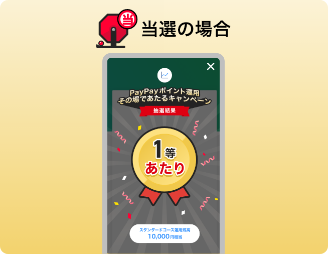 キャンペーン期間中の抽選で当選した額分のポイントを「スタンダードコース」の運用中残高(運用ポイント)として付与します。 <当選額> ・付与する運用中残高(運用ポイント)は同サービス内でのみ利用できますが、引き出してPayPayポイントに交換することが可能です(PayPayポイントの付与ではないのでご注意ください)。 |
